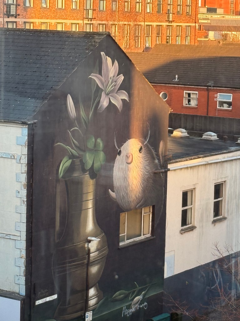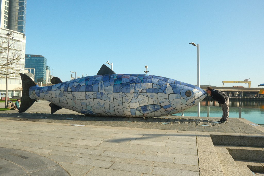 From the airport, we took an eco-friendly bus to Queens Square. Hot take: Belfast’s Albert Memorial clock is more proportional than Big Ben. There are few things I enjoy more than perusing google maps to find random sights or local attractions. A block towards the river stood a beautiful blue mosaic salmon. The Salmon of Knowledge. New tradition derived: Kiss da Fish.