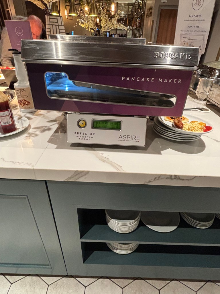 The bus ride to the airport from St Andrews was double the amount of time we spent in the air. With great fortune, Lucas got us into the airport lounge where we enjoyed complimentary breakfast. I’d never seen a pancake maker like this before – you press the yellow button to dispense batter and it cooks pancakes for you along a conveyer belt in a minute!