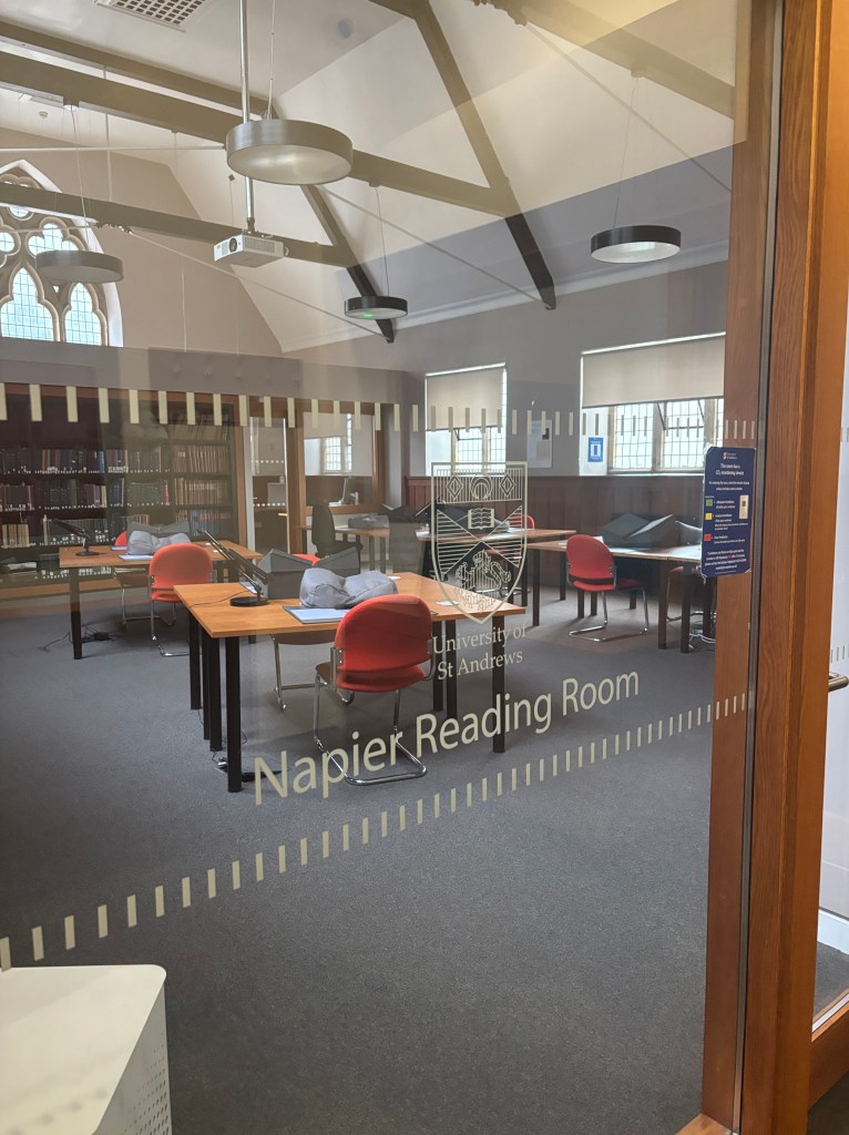 While studying for “Quantitative Research in Social Science” aka statistics for the social sciences, my youtube instructor dropped this fun fact, “Logarithms were invented by a mathematician from St Andrews named Napier over 400 years ago.”4 I stopped the playback, exited the main library room, walked a single digit amount of meters, and I stood at the doorstep of the Napier Reading Room in Martyrs Kirk Graduate Library. How cool.