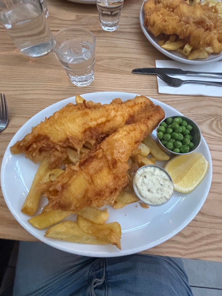 On the food front, it’s also been quite enjoyable. On Sunday, a large group of us savored brunch at the Northpoint – a cafe/restaurant steps from Deans Court. That evening, we followed up on a recommendation given by our dear driving instructor, Bill. He told us to find the best fish n chips local to St Andrews at Tailend on Market St. They did not disappoint!