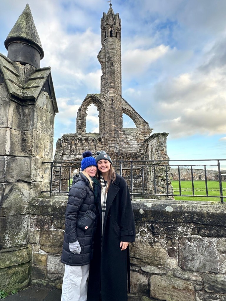 Speaking of reunions… Auntie Ginger and Uncle Dave popped up to St Andrews for the day! They are quite literate with the Scottish media, so they recognized many a famous site around St Andrews in selections like Karen Pirie. On this windy, rainy, quintessentially Scottish day, we enjoyed the cathedral, castles, gorgeous architecture, university quads, and a hearty meal.