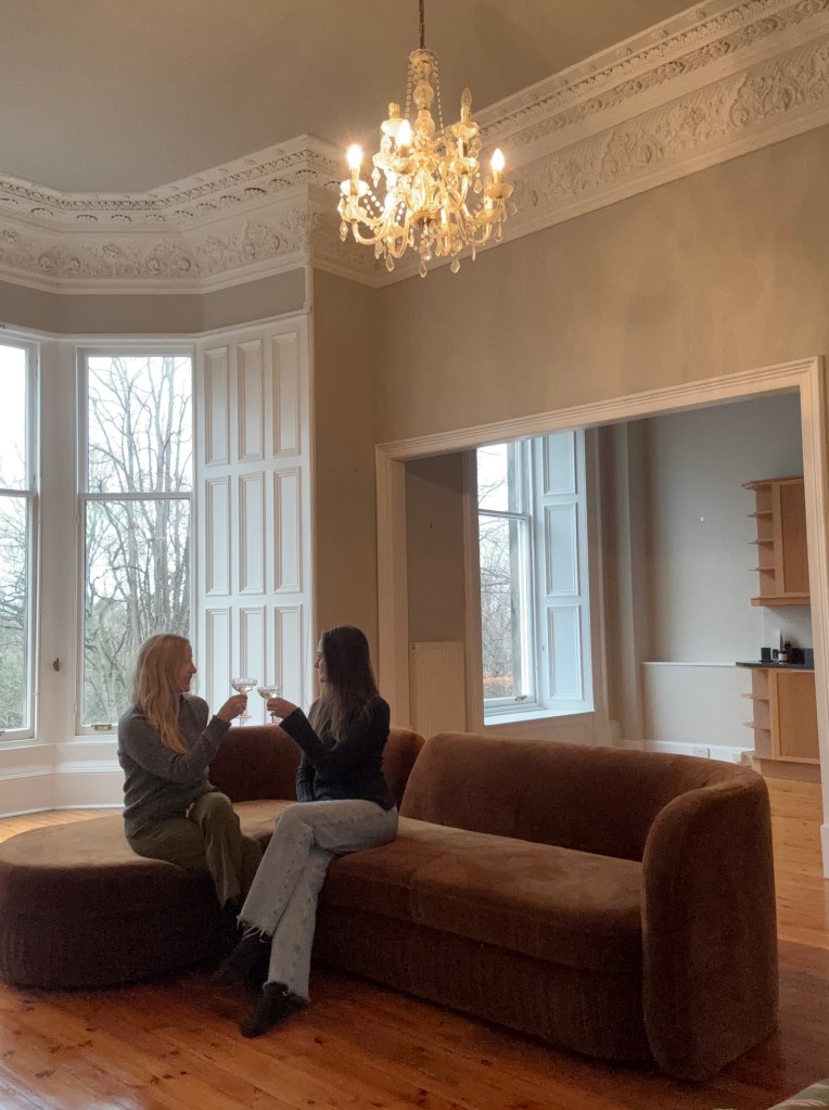 Left: Cheers to the new flat in Edinburgh! The ceilings and chandelier are simply spectacular.