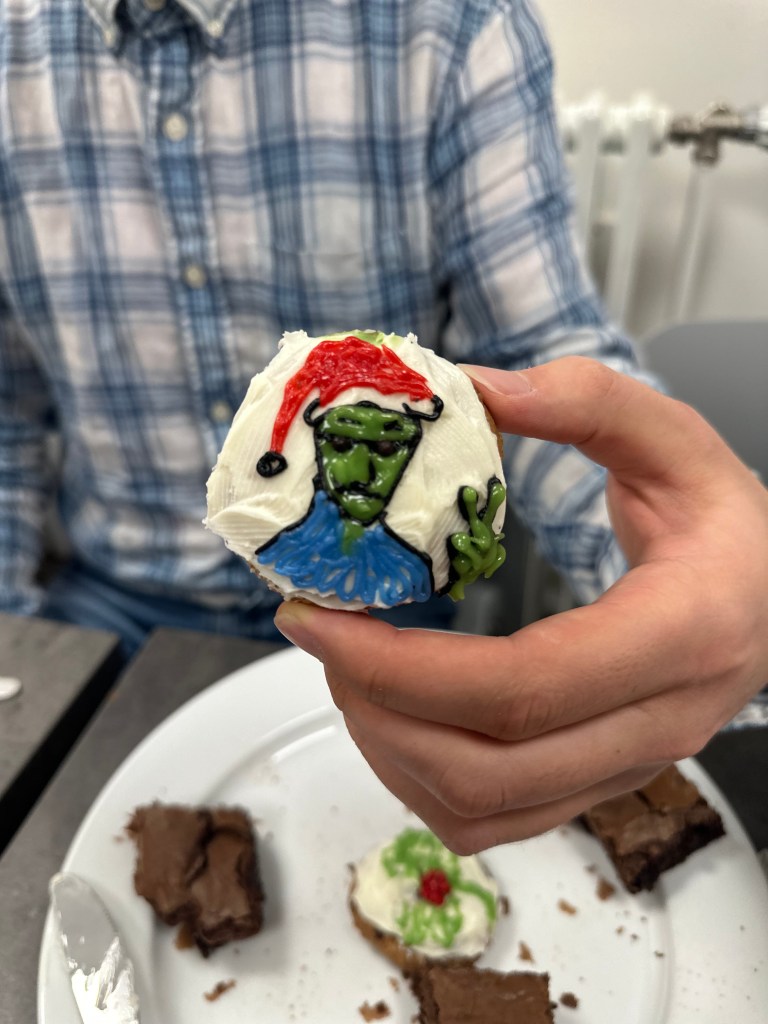 Lucas and I elevated the basic chocolate chip cookies with vanilla frosting and decided to test our artistic skills. Luckily, Philip and Courtney happened to arrive on the scene right when the decorating began, so it became a group effort.