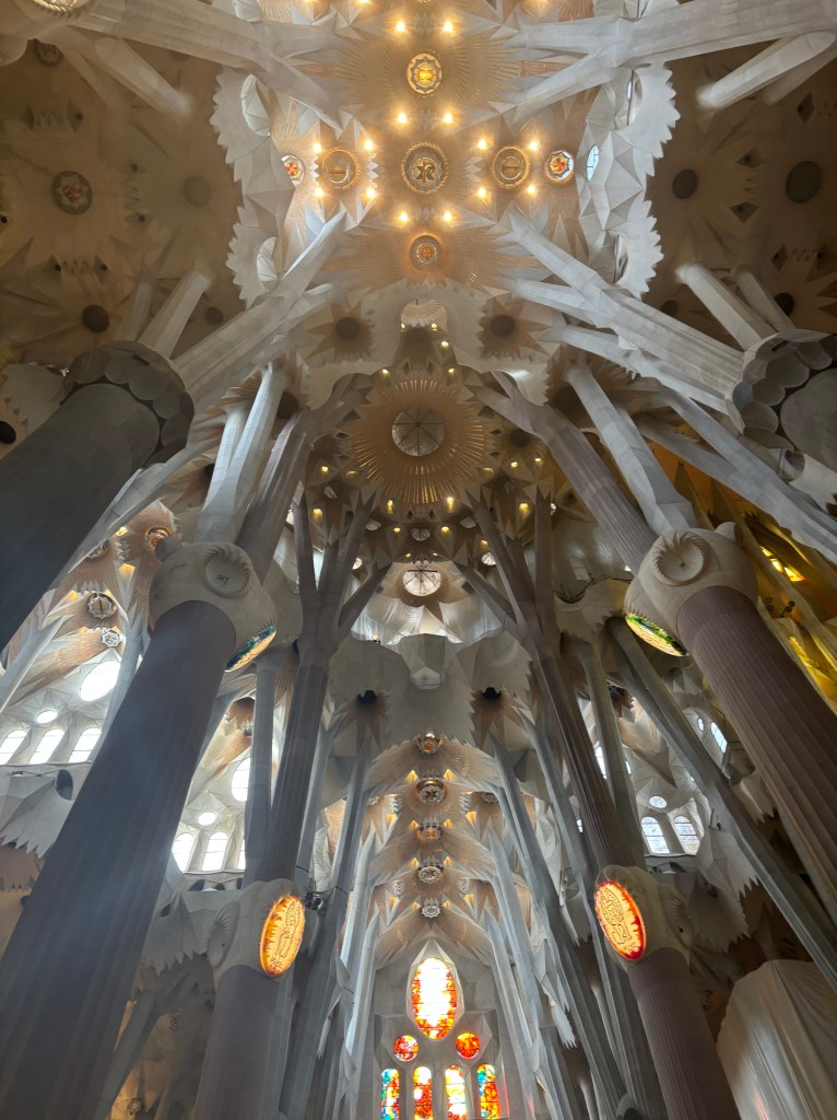 I most enjoyed learning about Gaudís remarkable engineering and design aptitude. He used string and chain models to experiment with different structural types . He wanted to maximise the structure’s light and design an organic structure, which is clearly exemplified through its double-twist pillars (which form a forest-like effect), the stunning stained glass windows, and the array of unique structural components like inclined columns, hyperboloids, parabolas, helicoids, and conoids.