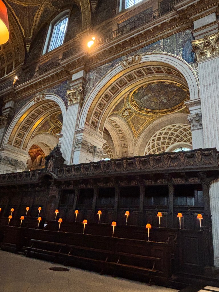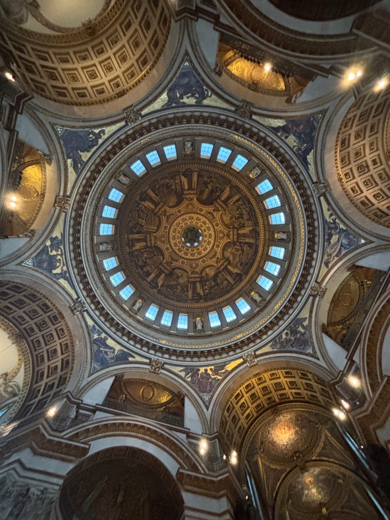 I don’t believe that every cathedral is worth a full walk-through tour or audio tour, but St Paul’s Cathedral certainly is one that deserves everything. Christopher Wren did his big one. We circumnavigated the whole church to find the correct entrance, or, rather, took the scenic route. We picked up individual guides that come with audio and video (upgrades, people!). As much as I value and recognize how cool it is that people train to become so well-versed in a site that they can show people around, I prefered this medium for St Pauls because it allowed me to sit down, listen, and replay at my own pace. I spent a good chunk of time ogling up at the beautiful ceiling murals depicting the life of Paul. My favorite section included Paul in Athens, wherein the council (who were Pagan) summoned him to “explain his faith” as Christianity was so new/foreign at the time. The other section I liked depicted The Conversion of Gaoler at Philippi-Macedonia. Paul and Sylis are thrown into prison. They pray to God, an earthquake opens the prison doors and shakes off their shackles. The jailer (understandably) freaks out and Paul prevents the jailer from committing suicide and thus converts to Christianity.