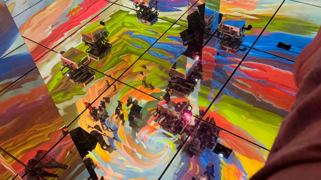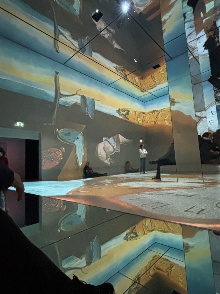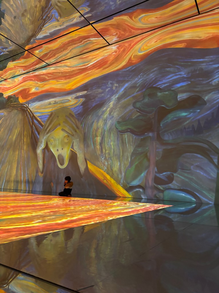 I did not have expectations coming into the Frameless art experience beyond hoping that it would be cool enough that my art-appreciative madre would have a good time. The exhibit featured four different rooms with slightly different takes on the ‘immersive’ art thing. In the ‘Beyond Reality’ room, mirrors lined the floors and ceilings, while projectors displayed reconstructed animations of famous stills across the four large walls. This room setup created the illusion of infinite floors above and below you, which becomes wild with dynamic visual art paired with audio and music. This room had about 12 different artworks featured, but my favorite were The persistence of Memory (Salvador Dalí), The Tree of Life (Gustav Klimt), The Scream (Edward Munch), and Project for: As you like it (Salvador Dalí).
